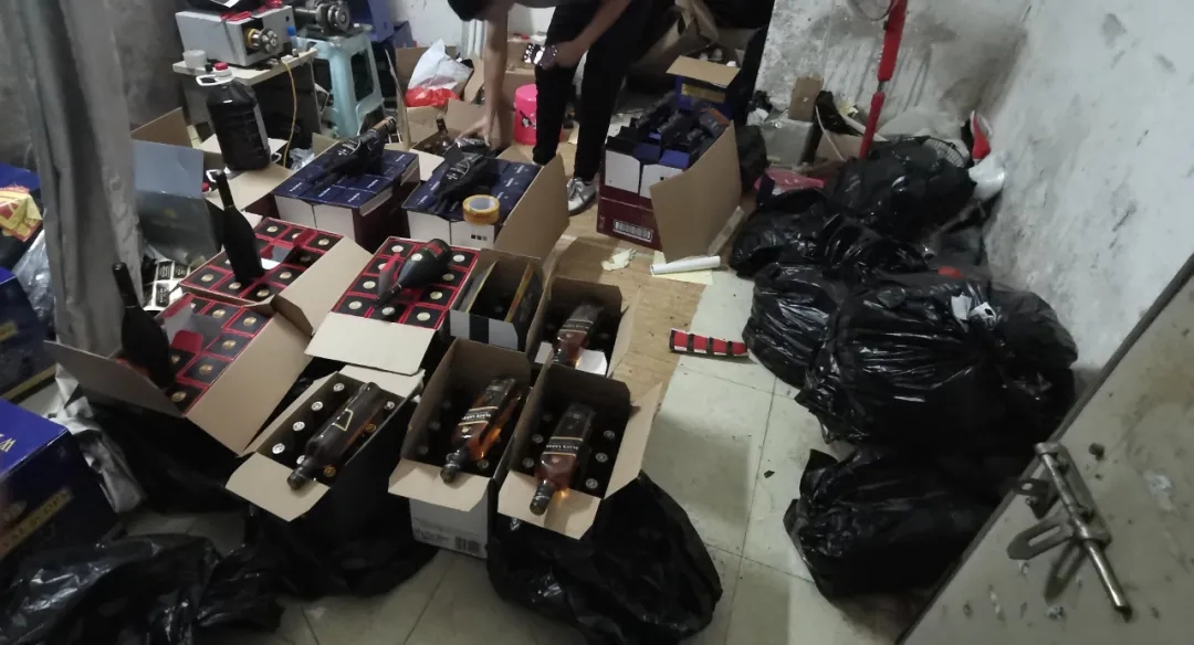 经过前期细致周密的摸排后,区镇两级市场监管部门、派出所、社区治安联防人员密切配合,果断出击,仅用半天时间就成功捣毁此2处窝点。共查获涉案假冒商标2万多个、假冒包装盒5000多个、回收的高档洋酒空瓶4000多个、用于造假的简易塑料瓶装的无标识酒液90余桶、激光打码机1台、瓶盖密封器1台,以及造假生产工具一批。现场查获成品假冒洋酒120余瓶,涉及马爹利、人头马、轩尼诗、芝华士、尊尼获加、杰克丹尼等多个知名洋酒品牌。