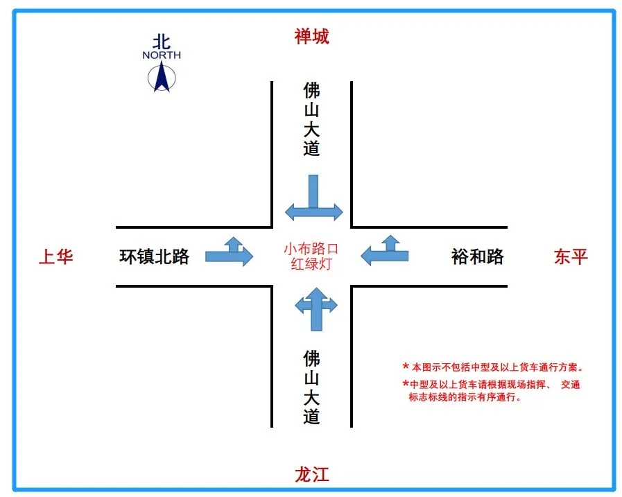 佛山大道南小布村工商业大道路口,北往南方向禁止直行(下沉隧道北往南方向封闭),东往西方向禁止左转,西往东方向禁止右转。