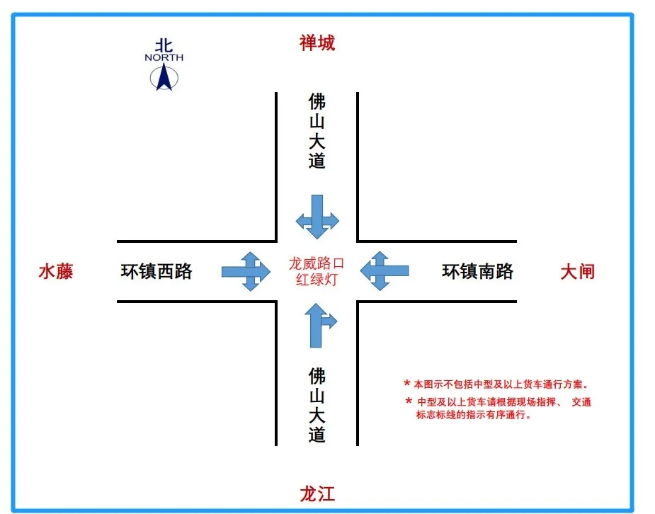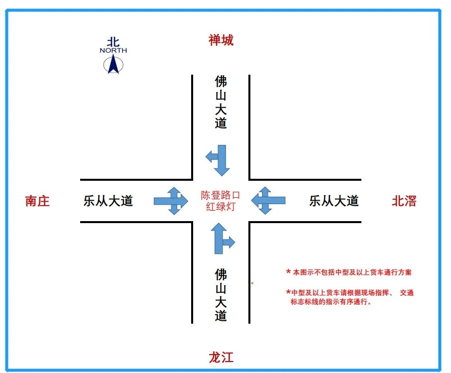 在原有交通管制基础上,对两条跨线桥北往南方向(禅城往顺德方向)禁止车辆上桥通行,并对佛山大道乐从小布隧道北往南方向进行交通管制,禁止该方向车辆进入小布隧道,指引车辆经小布隧道辅道绕道裕和路或环镇北路通行。届时,沿线的小布路口、三乐路口、陈登路口、龙威路口四个主要路口将实施如下管制: