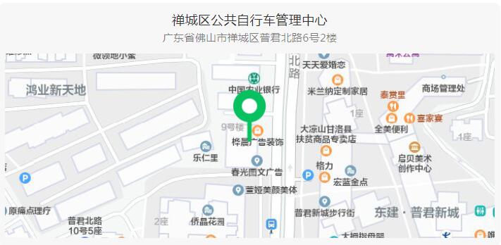 地点:禅城区公共自行车管理中心(普君北路六号二楼,农业银行往普君市场方向约30米)。