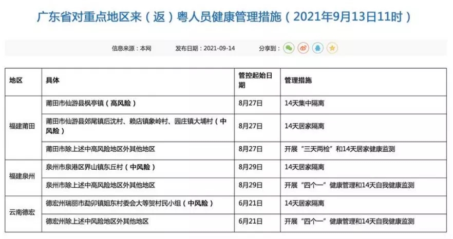 9月14日,根据疫情情况,广东省疾控中心最新更新广东省对重点地区来(返)粤人员健康管理措施,新增对福建泉州市泉港区界山镇东丘村(中风险)来粤返粤人员进行14天居家隔离;新增对福建泉州市除泉港区界山镇东丘村这一中风险地区外其他地区来粤返粤人员,开展“四个一”健康管理和14天自我健康监测,“四个一”健康管理,即发放一份健康告知书、开展一次健康问询、查验一次健康码、开展一次核酸检测。