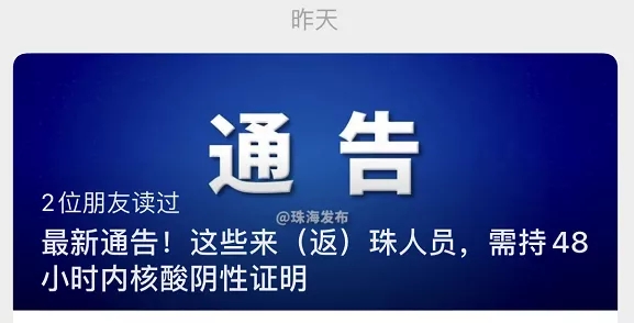 9月14日晚,珠海市新型冠状病毒肺炎疫情防控指挥部发布最新通告:从福建省来(返)珠人员,需持48小时内新冠病毒核酸检测阴性证明。