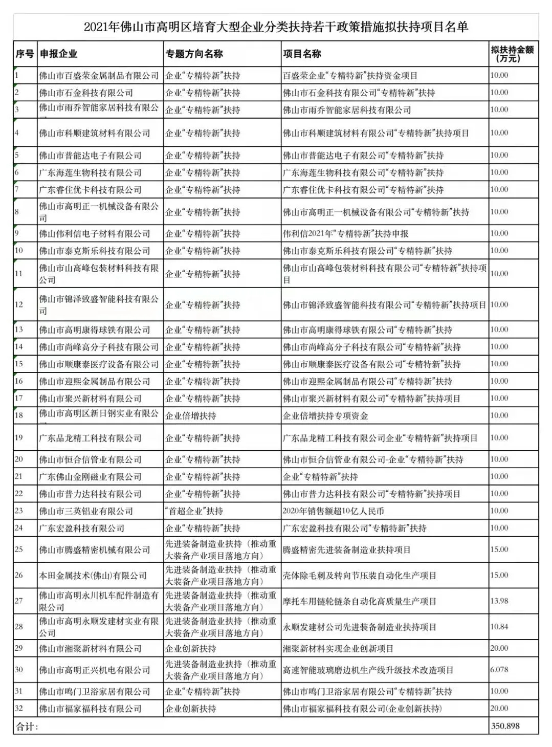 目前,高明区培育大型企业分类扶持若干政策措施拟扶持项目名单正在公示。根据名单,睿住优卡、泰克斯乐等32家高明企业拟获扶持金额共计350.898万元。