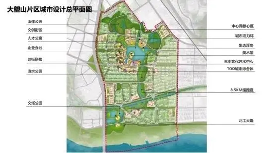 据介绍,大塱山城主要划分为科技产业集聚区,TOD生态居住区,百年文旅休闲区三大板块,将集新兴产业、高端商务、现代商贸及生态居住,打造成为功能复合的城市高端服务区。