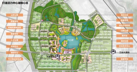 基于北江新区现状缺乏天际线变化,缺少公共开放空间和大型配套设施,西南街道谋划建设大塱山城,并在城内打造一个近15万㎡中心湖,拟创建为广佛地区最具魅力、最活力、最吸引年轻人和游客的滨水文创街区。