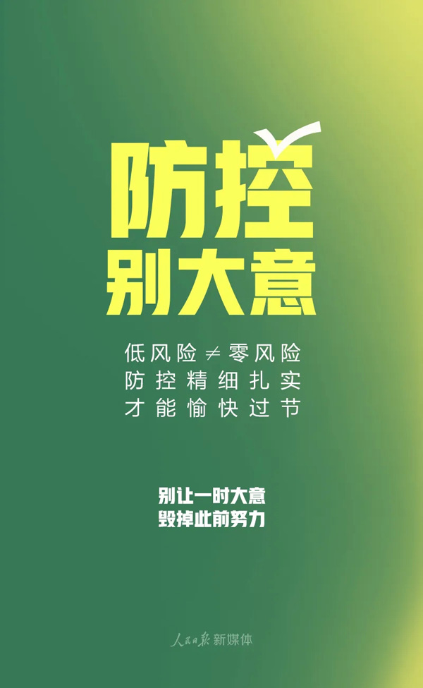 低风险不等于零风险,防控疫情,人人有责。广大市民要继续保持良好的个人防护意识,戴口罩、勤洗手、常通风、保持安全社交距离;不扎堆、不聚会,倡导健康生活方式。