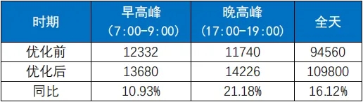 佛山大道中路段优化措施实施后,整体通行情况良好,其中工作日早高峰时段南北双向流量较优化前增加了10.93%,晚高峰时段南北双向车流量较优化前增加了21.8%,全天车流量较优化前增加了 16.12%。