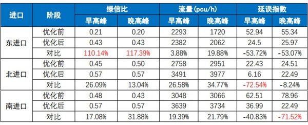 其中东进口通行效率较优化前提升一倍,通行延误指数下降 50%以上;北进口早高峰时段及南进口晚高峰时段通行延误指数下降 70%以上。
