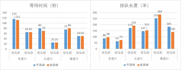 优化措施实施后,东、北进口车辆等待时间减少约50秒,南进口车流等待时间减少超过25秒,排队长度均有不同程度缩短,路口车辆通行秩序有所改善,具体情况如下所示。