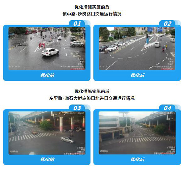 经巡查,优化措施实施后,镇中路-沙岗路口及东平路-澜石大桥底路口北进口交通运行情况变化不大,车辆通行顺畅,无明显车辆排队情况发生。