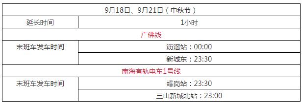 中秋即将到来,为方便市民节日出行,9月18日、9月21日(中秋节),广佛线、南海有轨电车1号线延长1小时运营服务时间。