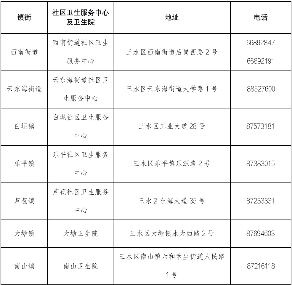 三水区提供基本公共卫生服务项目的机构主要是社区卫生服务中心(站)和乡镇卫生院,包括5个社区卫生服务中心和2个卫生院,详细情况如下表: