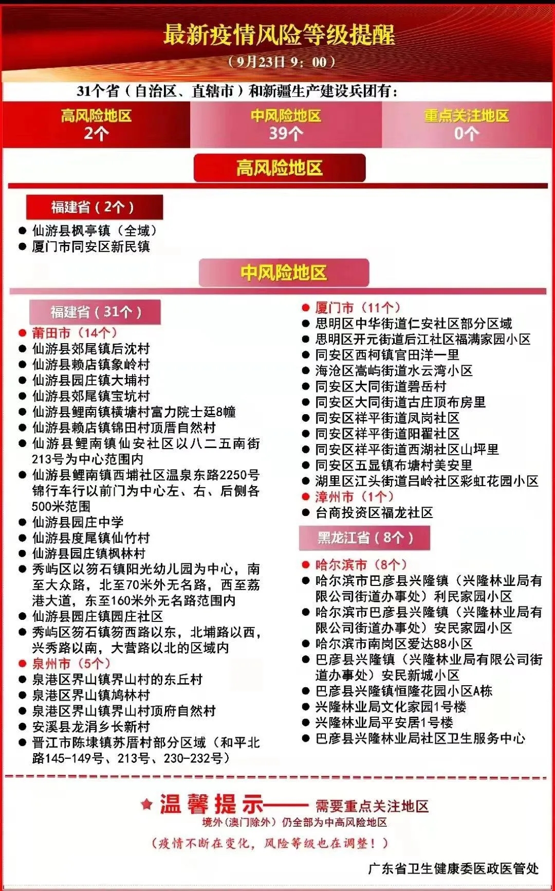 近期有福建省厦门市、泉州市、莆田市旅居史或9月7日以来有从哈尔滨市来(返)佛人员,请主动向所在社区(村)、所在单位、所住酒店报备个人行程情况。请自觉服从辖区措施安排,按安排做好核酸检测工作,并配合做好相应健康管控工作,详见以下《佛山市出行防疫政策》。