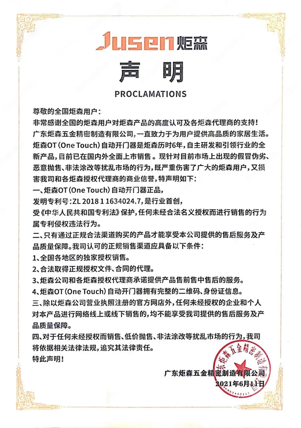 广东炬森五金精密制造有限公司,一直致力于为用户提供高品质的家居生活。炬森OT(One Touch)自动开门器是炬森历时6年,自主研发和引领行业的全新产品,目前已在国内外全面上市销售。现针对日前市场上出现的假冒伪劣,恶意抛售、非法涂改等扰乱市场的行为,既严重伤害广大的炬森用户,又损害我司和各炬森授权代理商的商业信誉,我司特此发布声明。