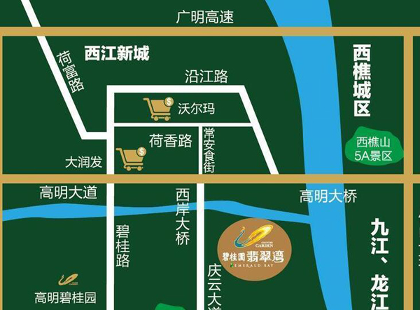 碧桂园翡翠湾位于西樵镇西岸新城区(西岸大桥侧),与高明城区一江之隔,西岸大桥连接高明大道,无缝接驳高明中心,乐享大润发、沃尔玛两大购物商圈。