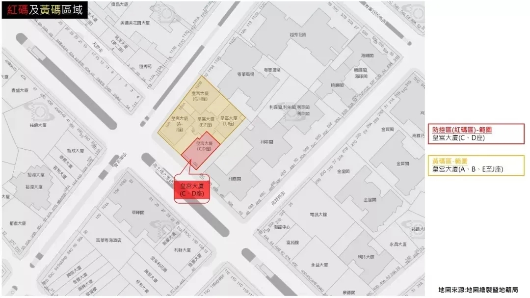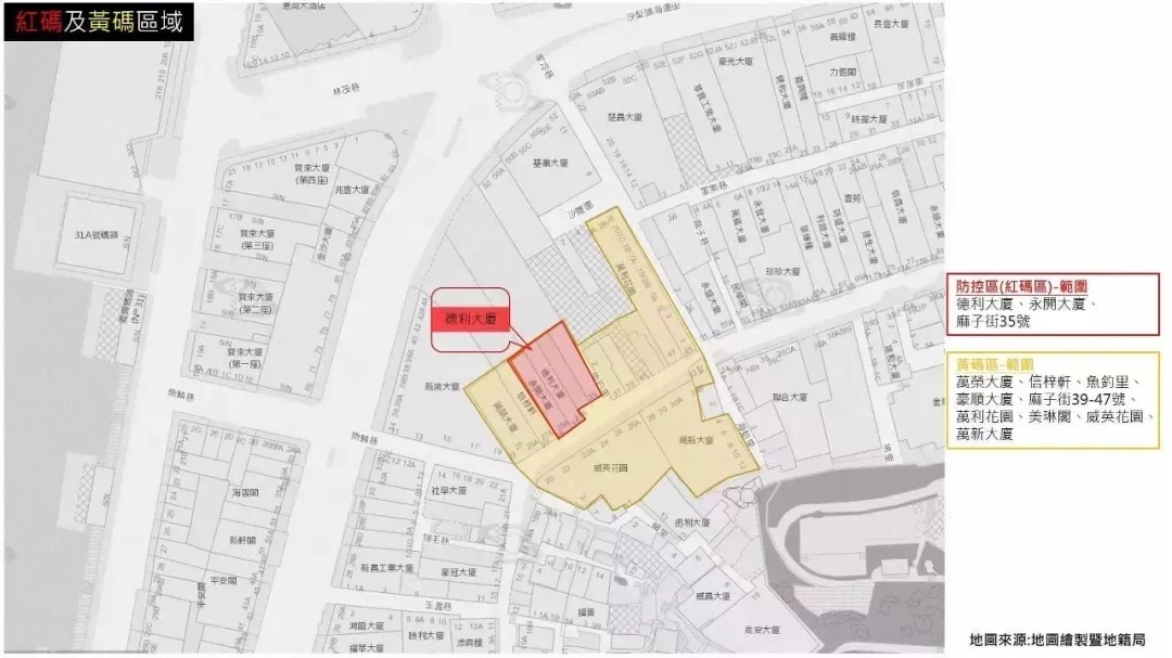 澳门应变协调中心将德利大厦、永开大厦、麻子街35号、皇宫大厦(C,D座)列为防控区,实施健康码红码管控;对防控区上述大厦邻近的万荣大厦、信梓轩、鱼钓里、豪顺大厦、麻子街39-47号、万利花园、美琳阁、威英花园、万新大厦、皇宫大厦A,B,E,F,G,H,I,J座(和C,D座不同入口)实施健康码黄码管制。