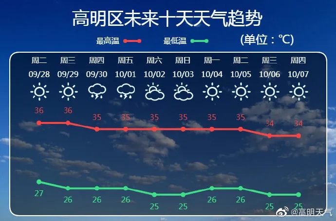 预计高明区未来十天晴热天气为主,其中30日到10月3日有雷阵雨,目前高明区高温黄色预警信号正在生效,请注意防暑降温。