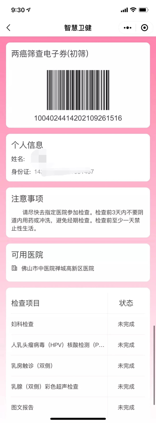 成功领券由系统自动发送短信:恭喜您成功领取“两癌”筛查免费检查服务,本次活动结束后,将由相应筛查医院以短信或电话形式通知您筛查时间,请留意短信或电话通知。