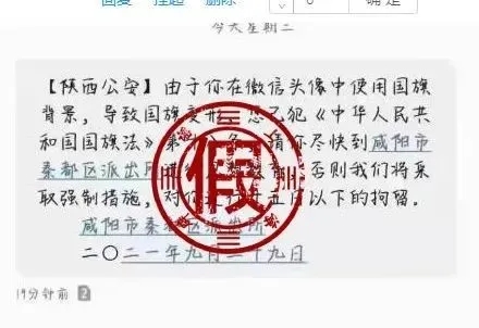 “由于你在微信头像中使用国旗背景,导致国旗变形,您已犯《中华人民共和国国旗法》第十八条,请你尽快到咸阳市秦都区派出所进行思想教育,否则我们将采取强制措施,对你进行十五日以下的拘留。”落款是“咸阳市秦都区派出所,2021年9月29日”。