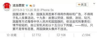 早在2015年9月3日,陕西省西安市司法局官方微博“@法治西安”曾科普过:“只要不是带有恶意,用国旗做头像并不违法。”