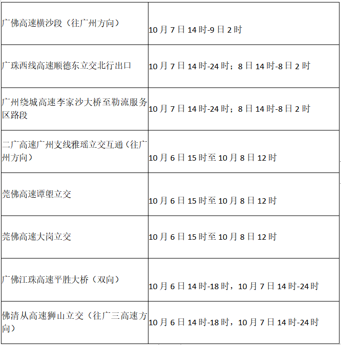 佛山公安交警预测,返程高峰将从10月6日下午14时开始,主要集中在6日、7日下午至晚间及8日上午。高速公路方面,易拥堵路段有:广佛高速横沙段(往广州方向),广珠西线高速顺德东立交北行出口,广州绕城高速李家沙大桥至勒流服务区路段,二广高速广州支线雅瑶立交互通(往广州方向),莞佛高速谭塱立交、大岗立交,广佛江珠高速平胜大桥(双向),佛清从高速狮山立交(往广三高速方向)。
