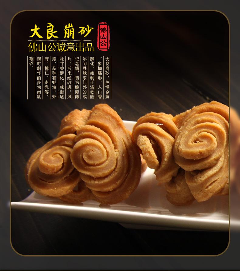 大良蹦砂有一段来历,大良人梁成章于清乾隆五十三年在其所设的"成记"油炸店创制。后经顺德李禧及后人的继承发扬和改进,逐渐形成了"李禧记"这个老字号。风味独特而为人推崇,继而驰名港澳、新加坡、马来西亚等地,是游客到广东必争购买的小食。