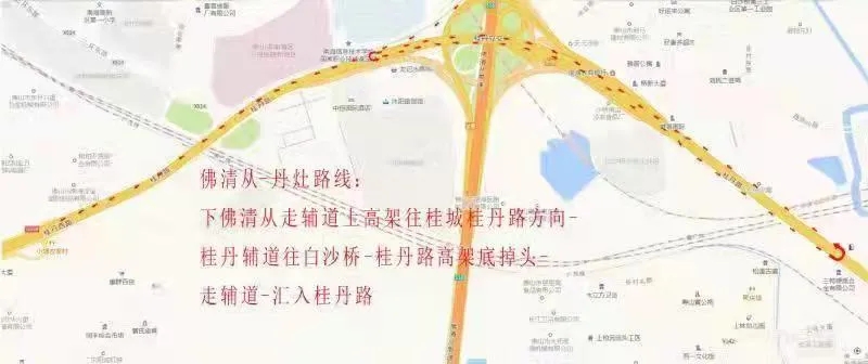 辅道上桂丹立交(桂城方向)-桂丹路辅路(往白沙桥村)-桂丹路高架底掉头-桂丹路辅道-汇入桂丹路(丹灶方向)