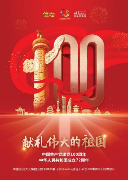 2021年是中泰建交46周年,是中国共产党成立100 周年;2021年10月1日,是新中国的72周年华诞,也是《@ManGu曼谷》杂志的9周岁!在中泰政府部门、文化机构、友媒单位、中资企业、侨团商会等社会各界的大力支持下,经所有主创人员历经数月精心策划,在这个“多喜临门”的日子,泰国亚洲大众集团旗下《@ManGu曼谷》杂志倾情推出“中泰友谊见证,200期典藏特刊”,献礼中泰关系、献礼中国共产党100周年、共祝新中国72岁生日快乐!