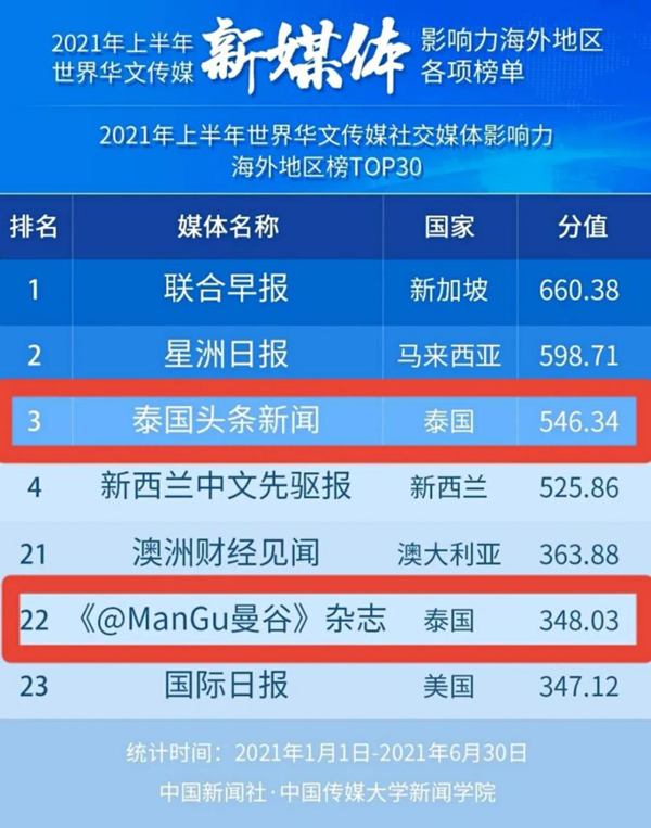 《@ManGu曼谷》杂志一路走来,不断为顺应着时代浪潮而发展、为跟随者科技创新而改变、为升华读者的阅读体验而优化,一次次突破自我、一次次顶住压力、一次次勇敢做出改变,但《@ManGu曼谷》杂志为传递好中泰两国的声音、讲好中泰两国的故事的使命感始终未曾改变。正是每一代杂志编辑对于使命的坚定不移,《@ManGu曼谷》杂志在迎来第200期的年份,获得了更高的肯定。在中国新闻社与中国传媒大学新闻学院联合开展的“世界华文传媒新媒体影响力”测评项目中,《@ManGu曼谷》杂志仅转型新媒体3个月便入选2021上半年世界华文传媒社交媒体影响力海外地区榜单高位!