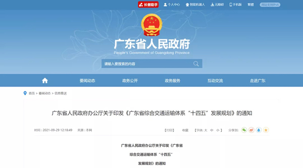 《规划》提出,“十四五”期间,广东加快形成以粤港澳大湾区为核心,汕头、湛江、韶关为极点,轴带支撑、多向联通的综合交通布局。到2025年,高速铁路和高速公路里程分别达3600公里、12500公里,民用机场旅客年吞吐能力达2.5亿人次,港口货物通过能力达21亿吨,国际航空航运枢纽影响力显著增强,国际运输网络连通度进一步提高。