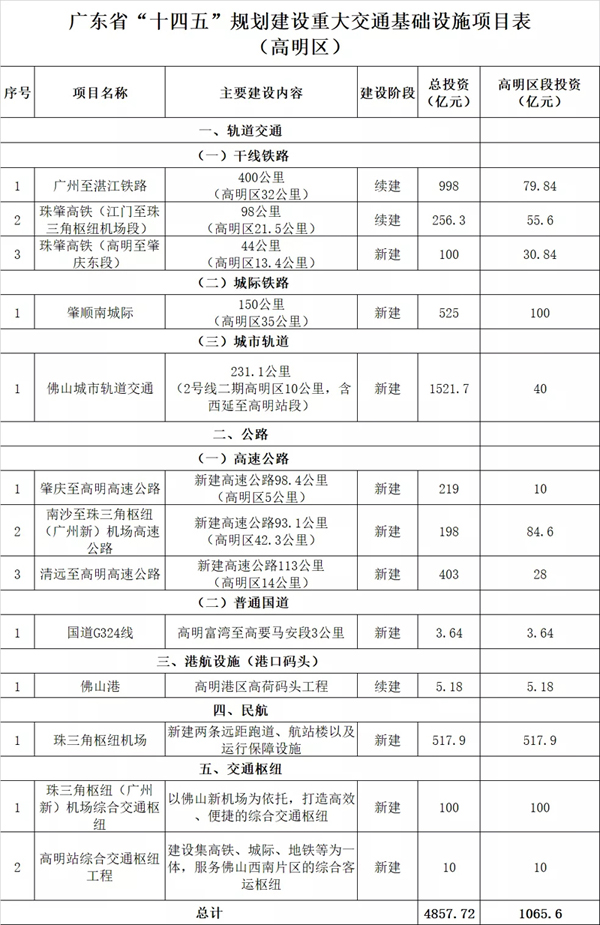 《广东省综合交通运输体系“十四五”发展规划》(以下简称:《规划》)近日印发,内容多次提及高明。其中,涉及高明区的项目多达13个,项目范围涵盖水、陆、空、铁,涉及高明区段总投资多达1065.6亿元。