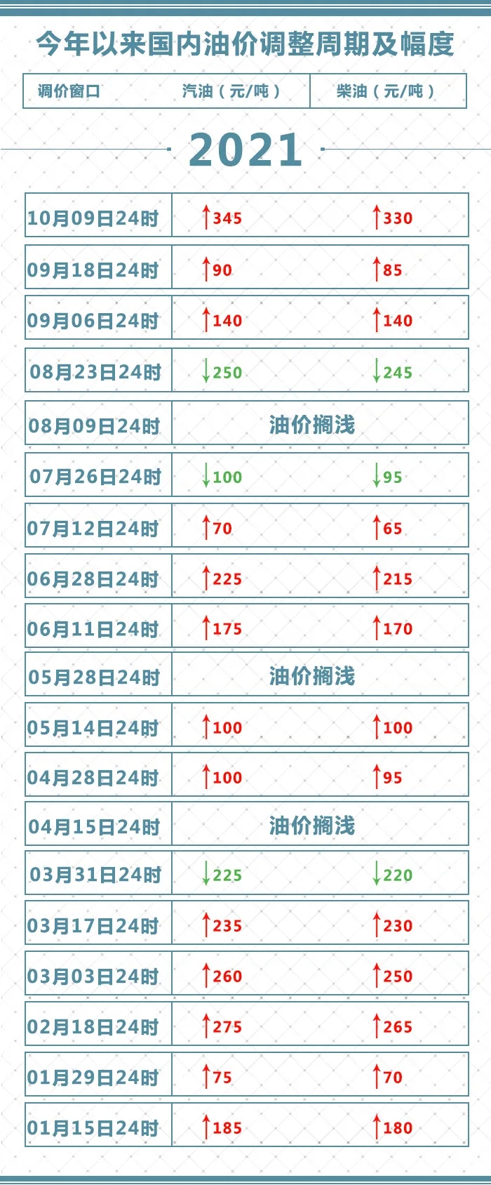 本次油价调整具体情况如下:汽油每吨上调345元,柴油每吨上调330元。