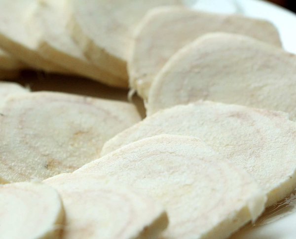 1、感官特征:外观呈橄榄形、块茎须根少,无分叉,有轻微皱褶,呈黄白色,葛肉乳白色;味道甘凉,微甜,无渣;新鲜合水粉葛水分≤55%。