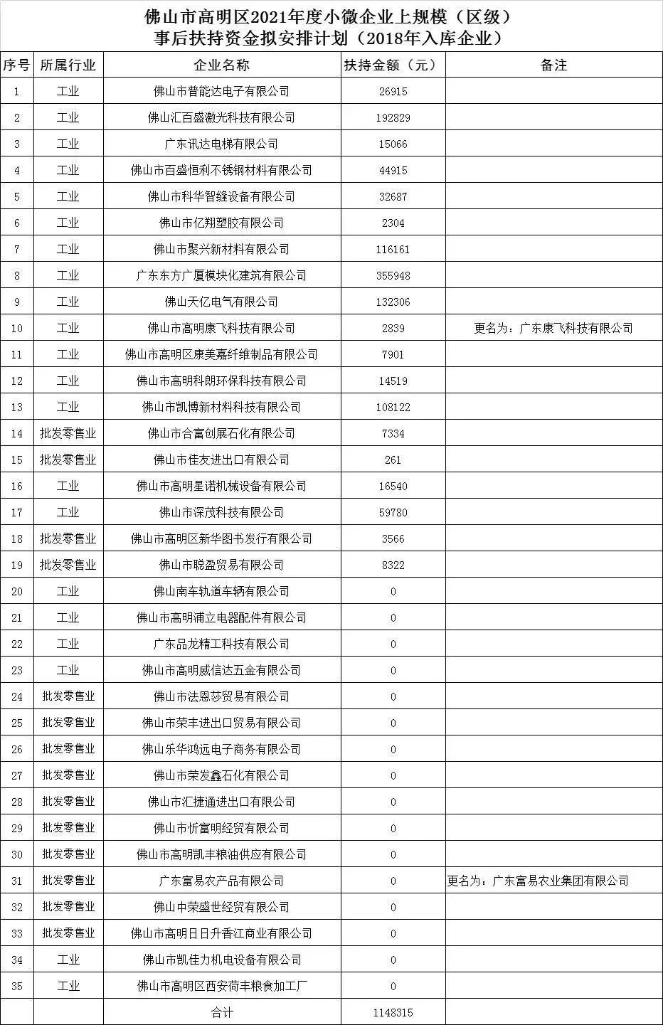 目前,高明区2021年度小微企业上规模专项扶持(区级)资金拟安排计划正在公示。公示内容显示,185家高明区“小升规”企业,拟将获得超2000万区级专项扶持资金。