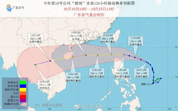 10日14时,今年第18号台风“圆规”(热带风暴级)的中心位于距菲律宾马尼拉东偏北方约830公里的洋面上。预计,“圆规”将以25公里左右的时速先向偏西方向移动,11日夜间进入南海东北部海面后,以30公里左右的时速快速西移,强度加强,趋向南海西北部海面。