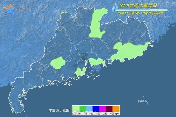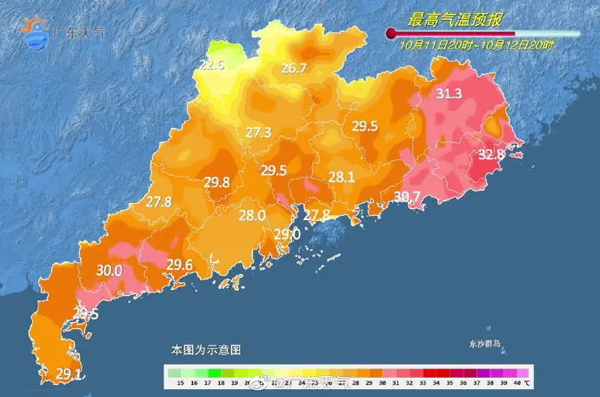 11日,广东大部多云间晴为主,粤西有分散阵雨,另外受中等偏弱冷空气影响,我省北部气温下降3℃~5℃,中南部气温下降2℃~4℃,各地昼夜温差加大,早晚天气清凉。13日受“圆规”的环流影响,广东南部市县及海面将有明显风雨。