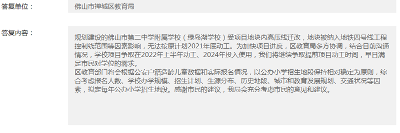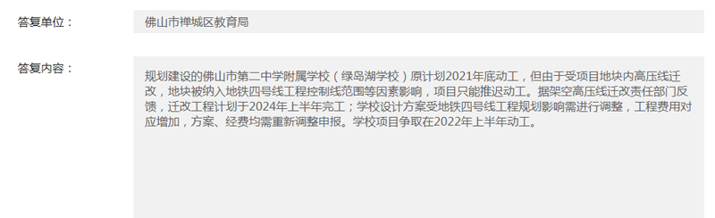 对此,佛山市禅城区教育局官方予以了回应:规划建设的佛山市第二中学附属学校(绿岛湖学校)原计划2021年底动工,但由于受项目地块内高压线迁改,地块被纳入地铁四号线工程控制线范围等因素影响,项目只能推迟动工。据架空高压线迁改责任部门反馈,迁改工程计划于2024年上半年完工;学校设计方案受地铁四号线工程规划影响需进行调整,工程费用对应增加,方案、经费均需重新调整申报。学校项目争取在2022年上半年动工。