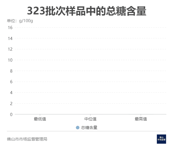 323批次样品中的总糖含量最高值为13.4g/100g,最低为0.9g/100g,中位值4.8g/100g。