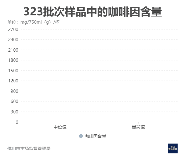 本项目共抽检323批次奶茶类样品,样品中的咖啡因含量按1大杯750mL(g)换算,最高值为625mg/杯,最低值为未检出,中位值为104mg/杯。