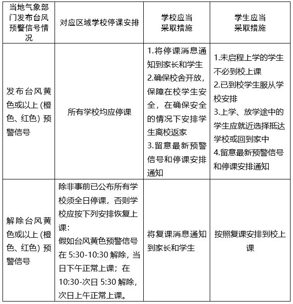 台风天气影响下停课安排及应当采取的措施: