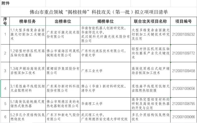 10月13日,记者从佛山市科技局获悉,佛山市科学技术局正在对佛山市重点领域“揭榜挂帅”科技攻关(第一批)拟立项方案进行公示。佛山重点领域“揭榜挂帅”科技攻关(第一批)拟立项项目清单显示,本次榜单任务共6个,涵盖高端装备制造、新材料等领域。