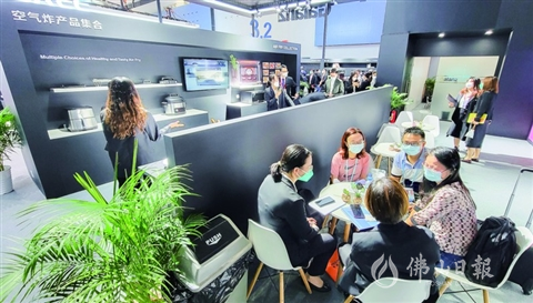 昨日,参展人员在广交会格兰仕展位洽谈。/佛山日报记者周春摄