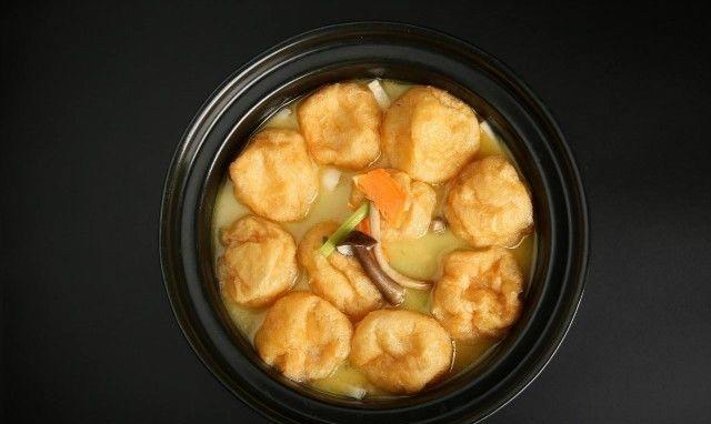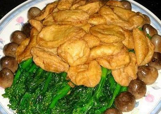 鱼腐是广东佛山市石湾的地方传统名菜。石湾历史上隶属南海县,又与顺德县紧邻,是一个鱼米之乡的小集镇,这里传统鱼类食谱名目繁多,鱼腐便是其中的一种。鱼腐是以鲮鱼肉、鲜蛋做原料,经过油炸而成。既可扒菜,亦可放汤,鱼腐入口干香,滑嫩爽口,风味独特,老少皆宜。本品以菜心垫底,亦名碧绿鱼腐,颜色艳丽,黄白相间,有荤有素,清淡素雅,乃石湾民间传统佳肴,在岭南各地广泛流传。