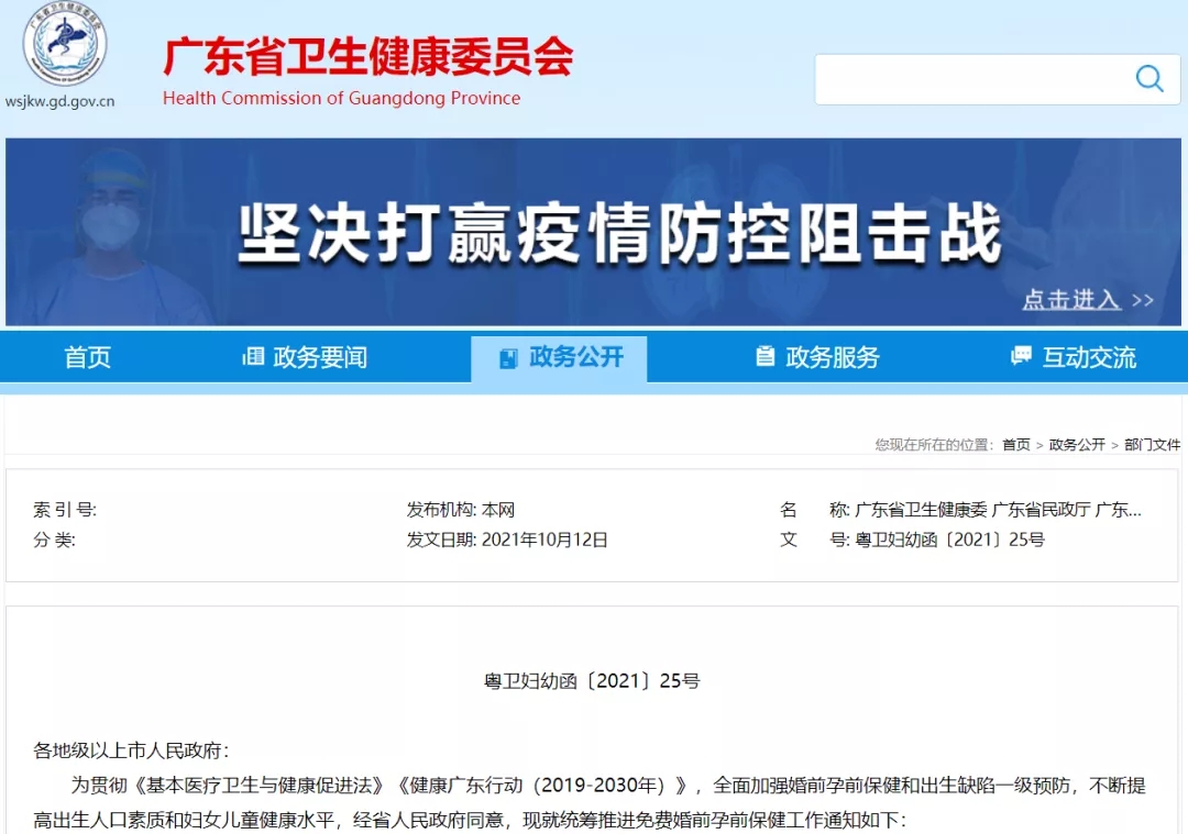 近日,广东省卫生健康委、省民政厅、省妇女儿童工作委员会办公室联合发布了《统筹推进免费婚前孕前保健工作通知》(以下简称《通知》),以全面加强婚前孕前保健和出生缺陷一级预防,不断提高出生人口素质和妇女儿童健康水平。