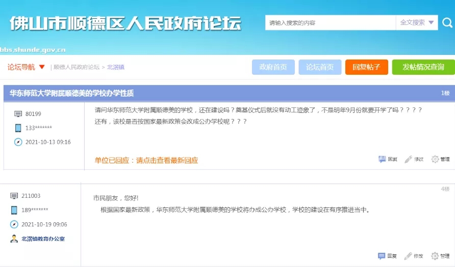 “民转公”相关政策发布以来,不少家长都关注佛山各个民办学校及在建学校的情况。最近,有网友也关注到华东师范大学附属顺德美的学校的办学性质问题,在顺德区人民政府网论坛上询问学校是否还在建设,是否会按照国家最新政策改成公办学校。10月19日,北滘镇教育办对网友的提问进行了回复,“根据国家最新政策,华东师范大学附属顺德美的学校将办成公办学校,学校的建设在有序推进当中”。