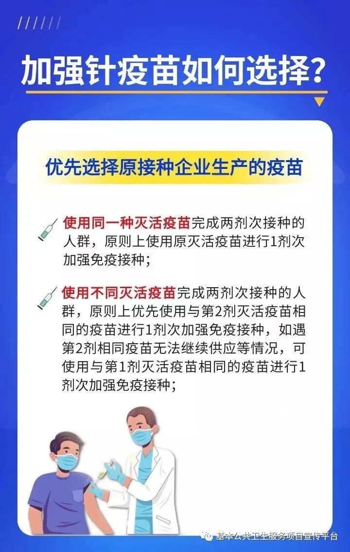 使用同一种灭活疫苗完成两剂次接种的人群,原则上使用原灭活疫苗进行1剂次加强免疫;使用不同灭活疫苗完成两剂次接种的人群,原则上优先使用与第二剂次灭活疫苗相同的疫苗进行1剂次加强免疫。