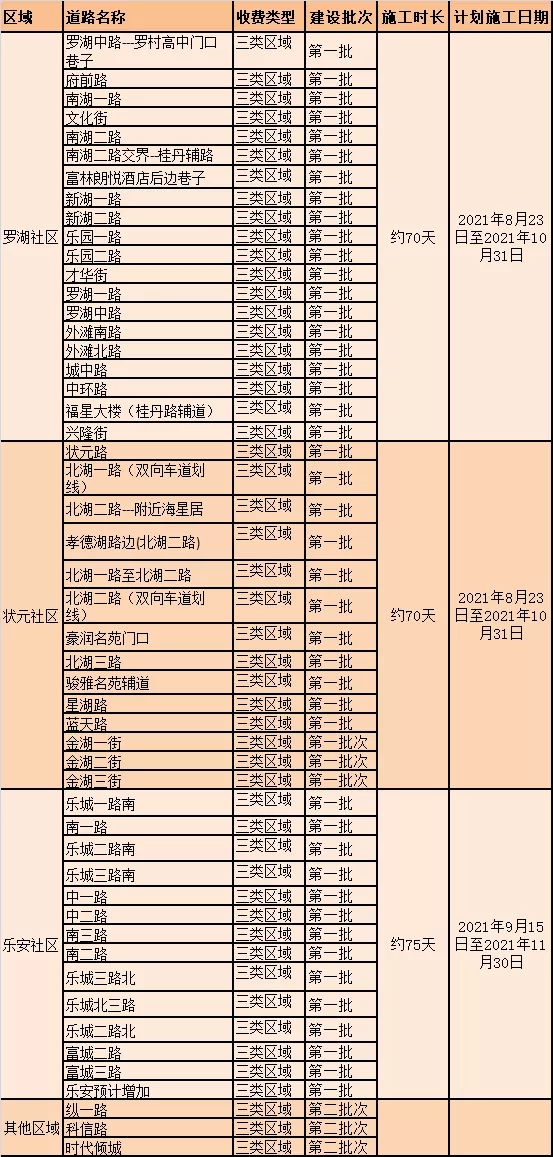 一期项目建设改造:覆盖商业繁华路段约2649个车位,实施范围为罗湖社区、状元社区、乐安社区等商业繁华路段。首期交付车位计划于2021年12月上旬建成并投入试运营,2022年1月1日起正式收费。
