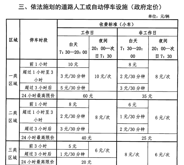 2.一类、二类区域停放时间不超过15分钟的免收机动车停放服务费;三类区域停放时间不超过30分钟的免收机动车停放服务费,超过免费时段按实际停放时间计费。