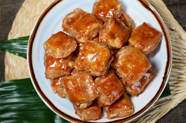 鸡仔饼是广东四大名饼之一。仅是外形,就让人一见钟情:娇小的身段,椭圆形略似美女的鹅蛋脸,在几乎清一色正圆形的饼饵群体中显出另类美。皮薄馅少的,吃起来比较脆;皮厚馅丰的,酷似国画大师齐白石老人笔下正在俯首觅食的小鸡,外脆内软,很有嚼头。咬一口,只听"咯咯"作响,浓香像一股决堤的洪水奔涌而出,再咬几口,恍若引爆了一个香料库,复合香气从馅里迸射四溅,浓得化不开,直至进入了深度咀嚼阶段,才逐渐分辨出蒜茸的辛香、南乳的鲜香、芝麻的油香、肥肉的甘香…