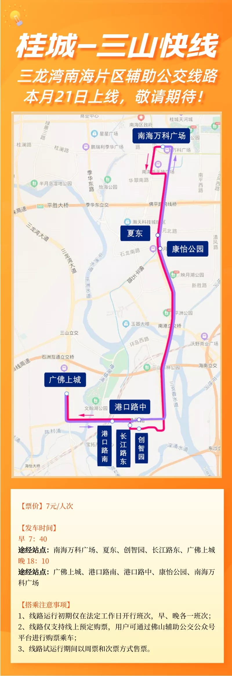 “桂城-三山快线”串联起桂城以及三龙湾南海片区的多个交通要点,该线路途经南海万科广场、映月湖环宇城、创智园、三山科创中心、广佛上城等多个主要客流集散点,实现公交地铁零距离接驳,有效满足上班族的通勤需求。